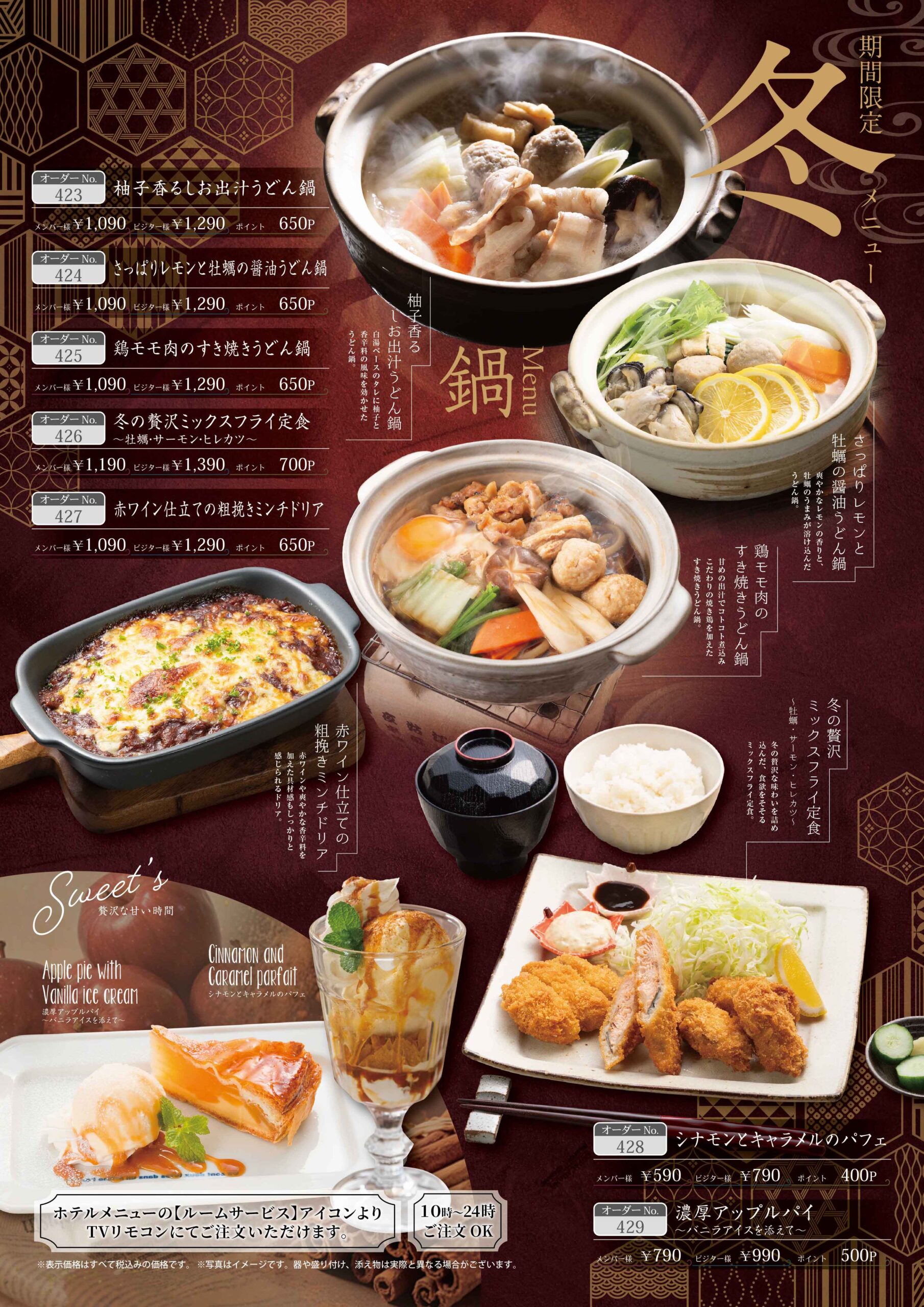 寒さが本格的になってまいりました。当ホテルでは、寒い季節にぴったりの**「冬の期間限定メニュー」**の販売を開始いたしました。