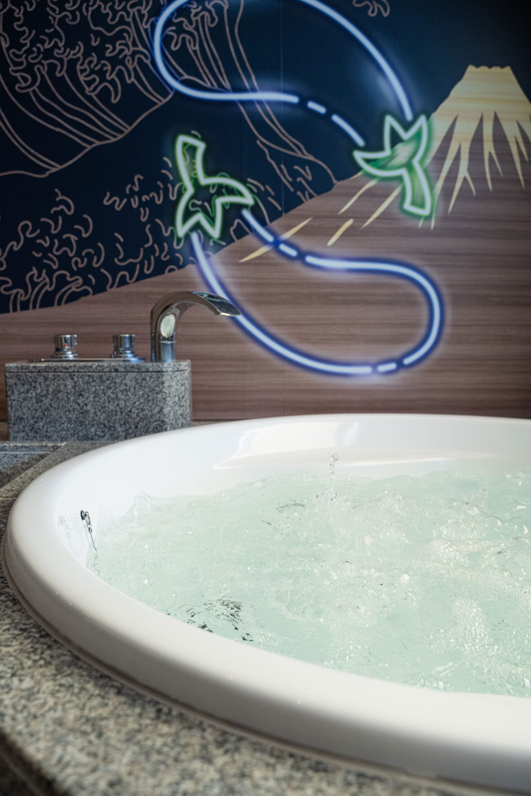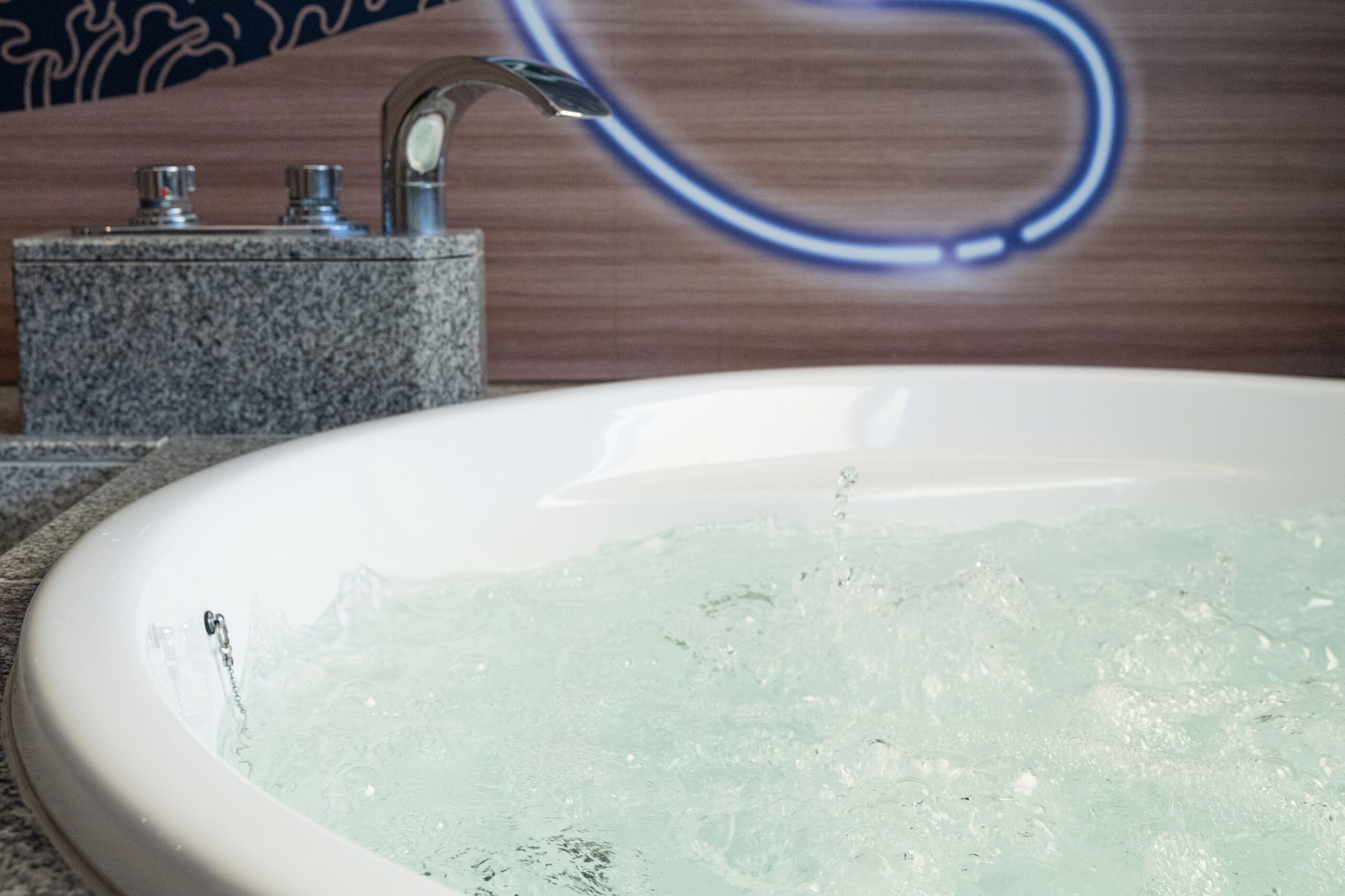 客室の内風呂でも、美容と健康に良い「ラドン」と「ゲルマニウム」の人工温泉をお楽しみいただけます。浴室のデザインも客室ごとに趣が異なり、空間ごと味わえるバスタイムに。サウナ後の水風呂としてもご利用でき、ご希望に応じて氷を加えて温度を下げることも可能です。