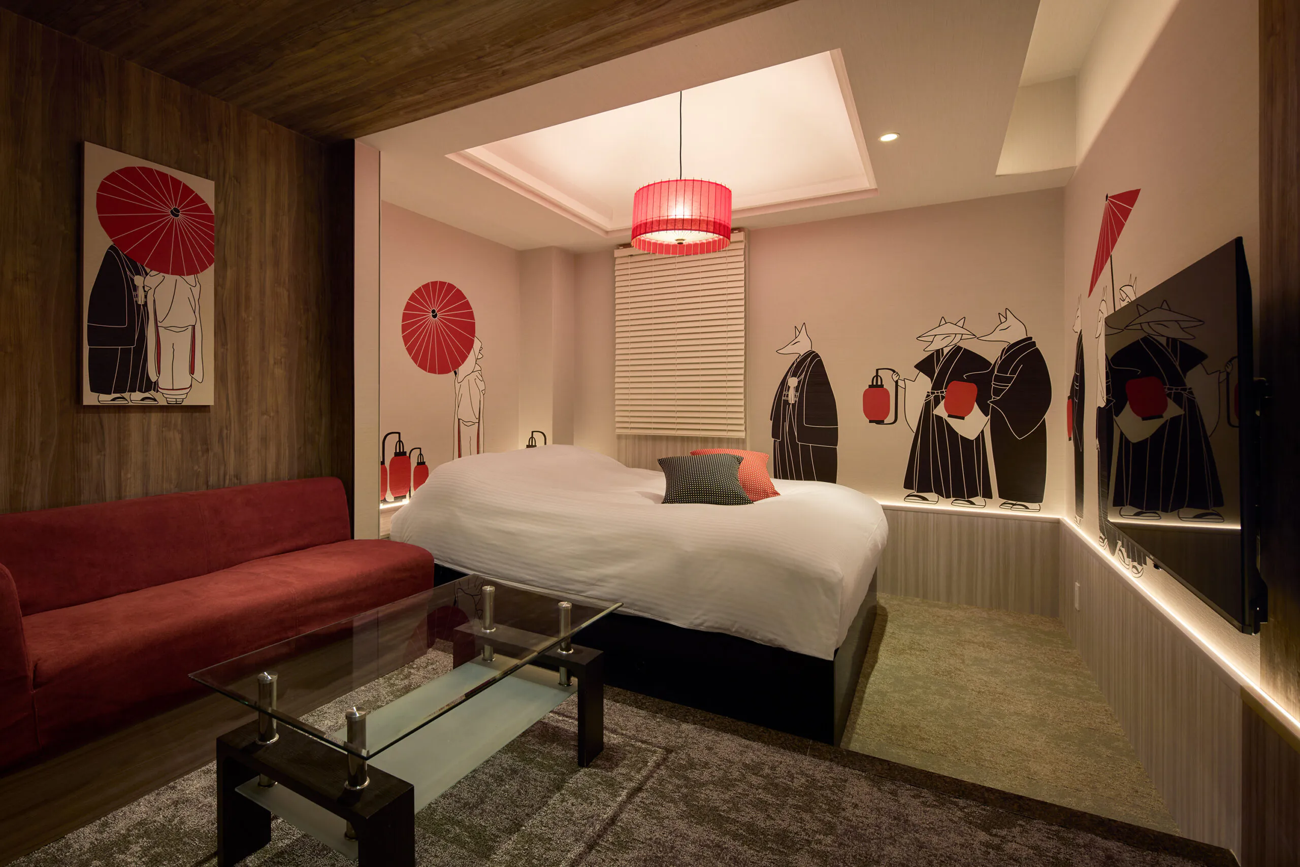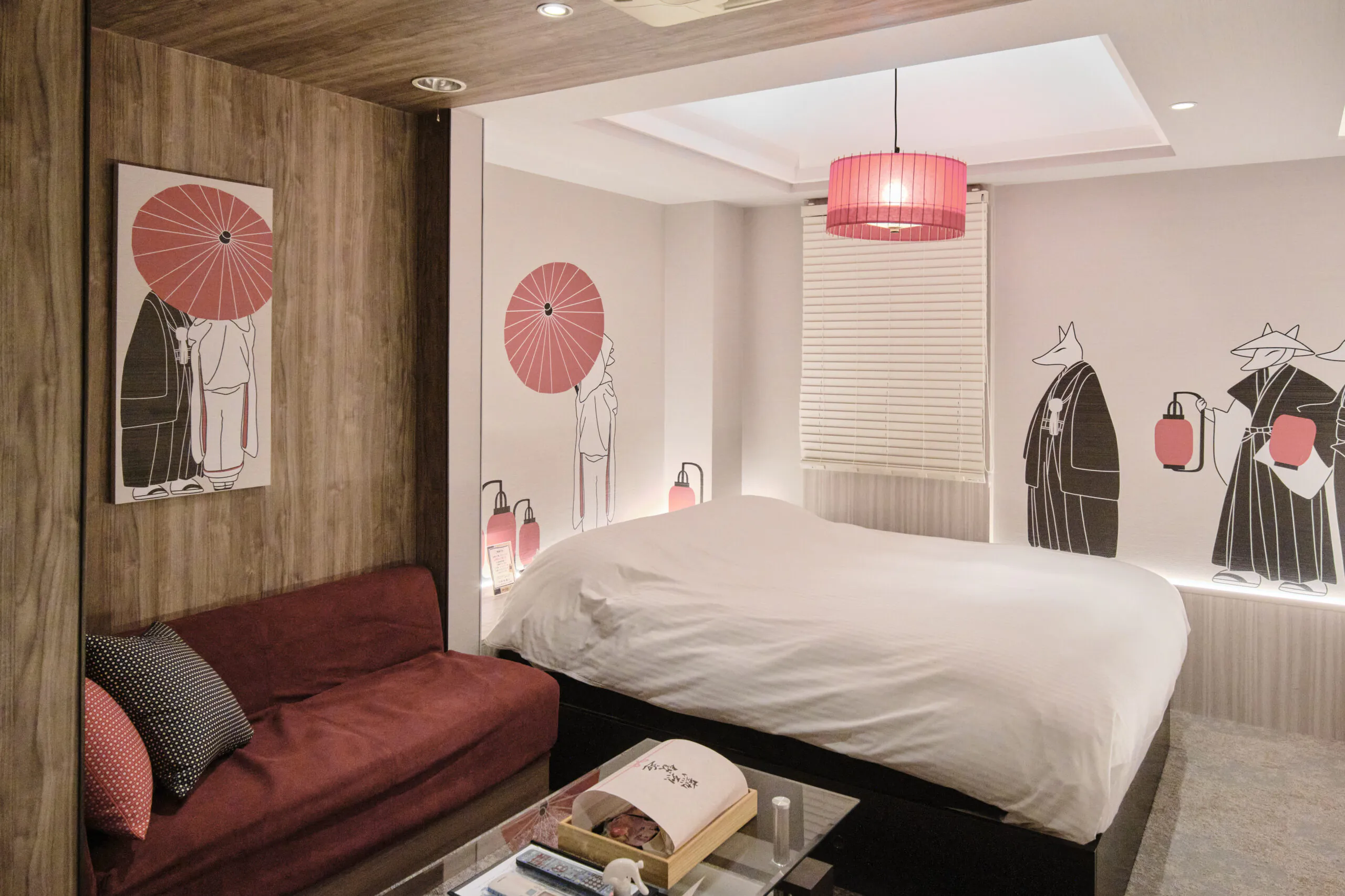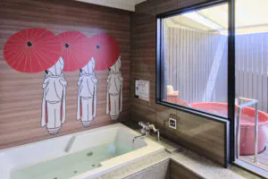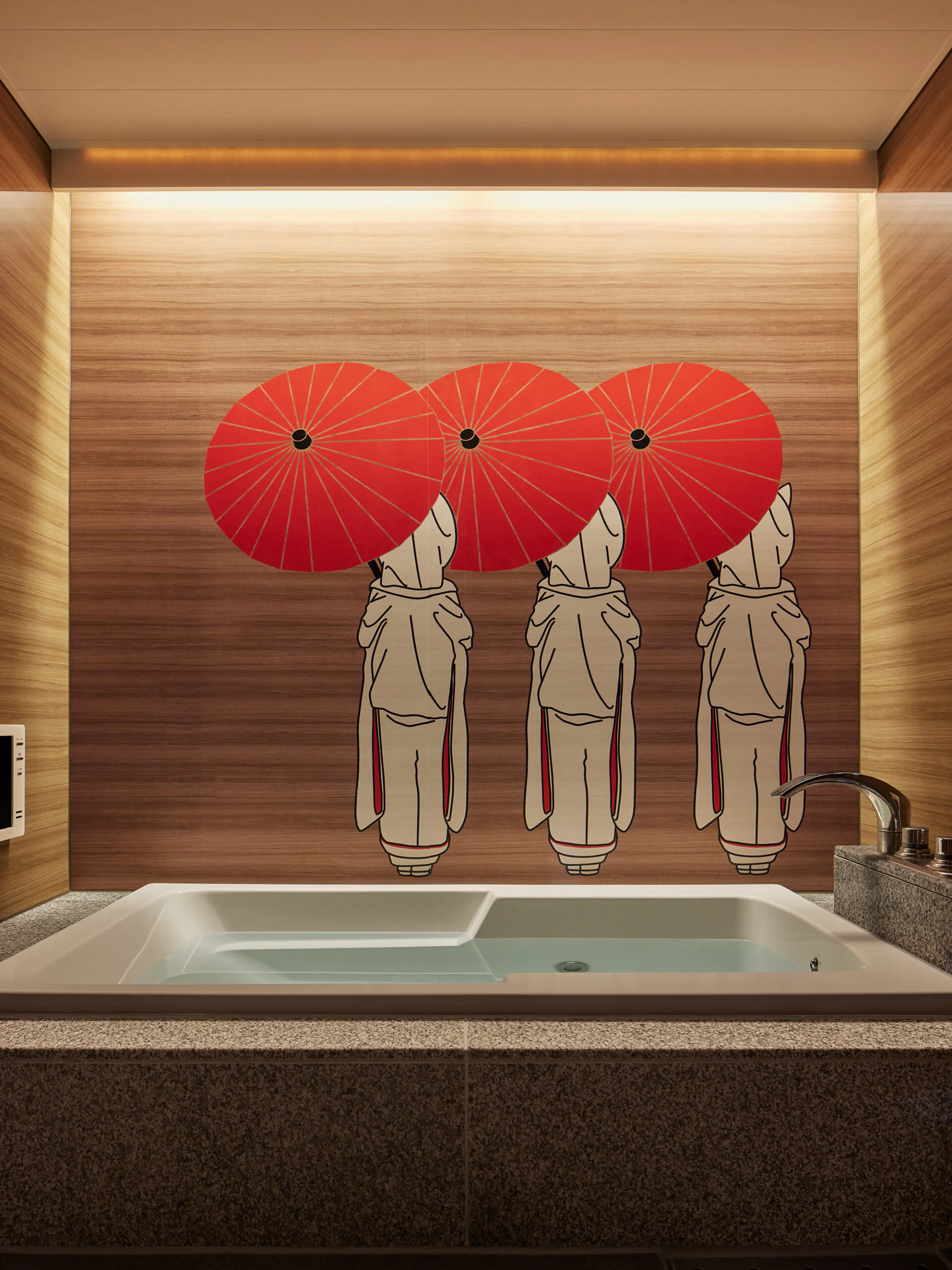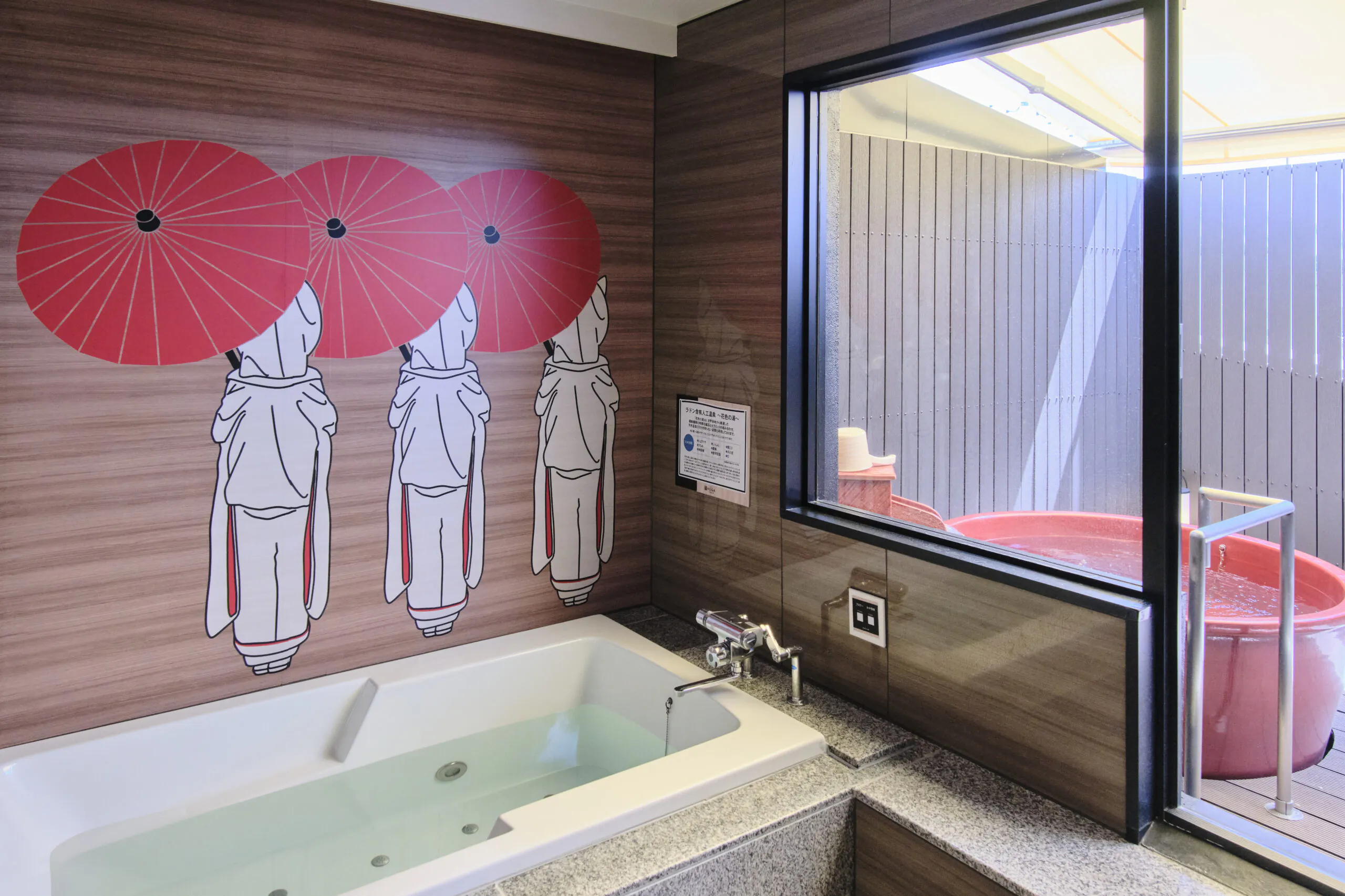 狐の嫁入りがモチーフのお部屋。浴室は赤をアクセントカラーに、おめかしした狐の赤和傘と露天信楽浴槽の赤鉄色がより引き立つ空間にデザインしました。