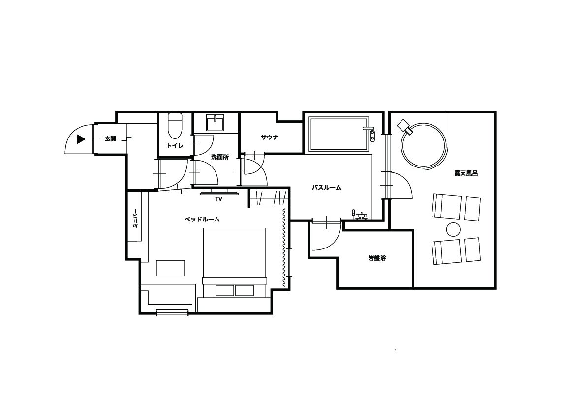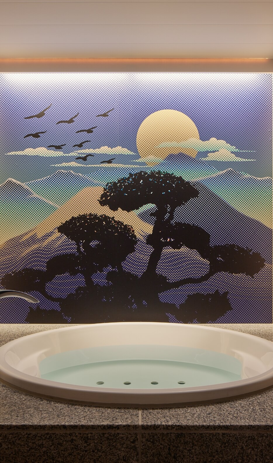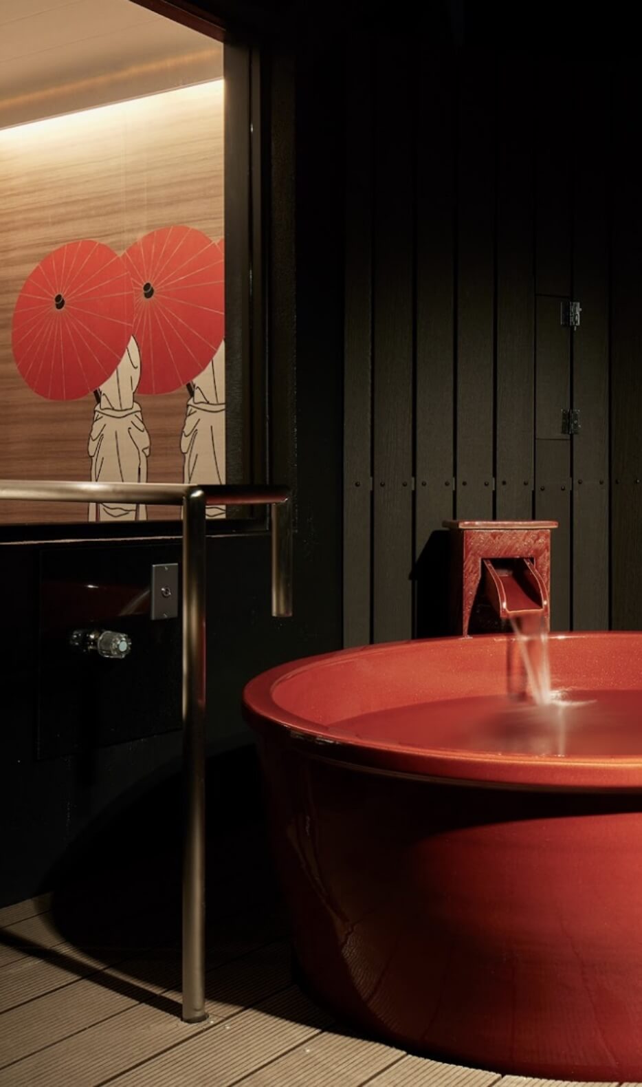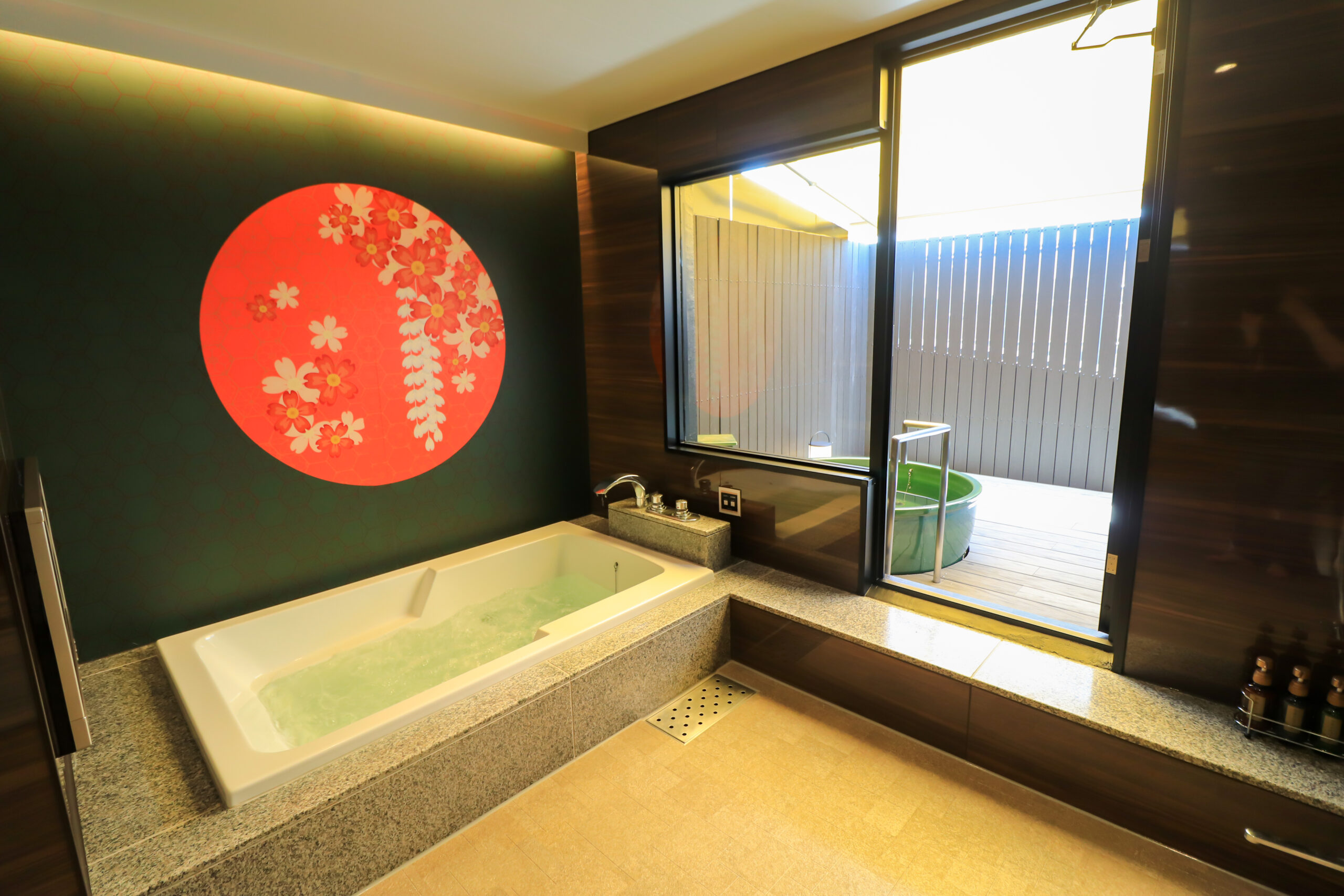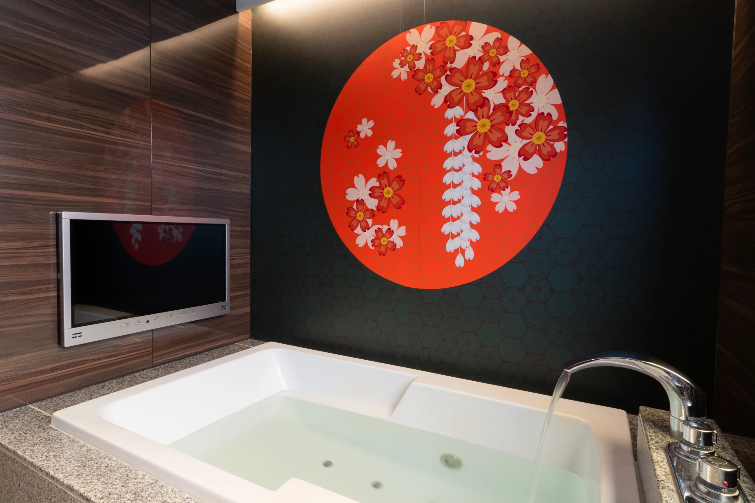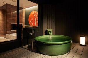 客室の内風呂でも、美容と健康に良い「ラドン」と「ゲルマニウム」の人工温泉をお楽しみいただけます。浴室のデザインも客室ごとに趣が異なり、空間ごと味わえるバスタイムに。サウナ後の水風呂としてもご利用でき、ご希望に応じて氷を加えて温度を下げることも可能です。