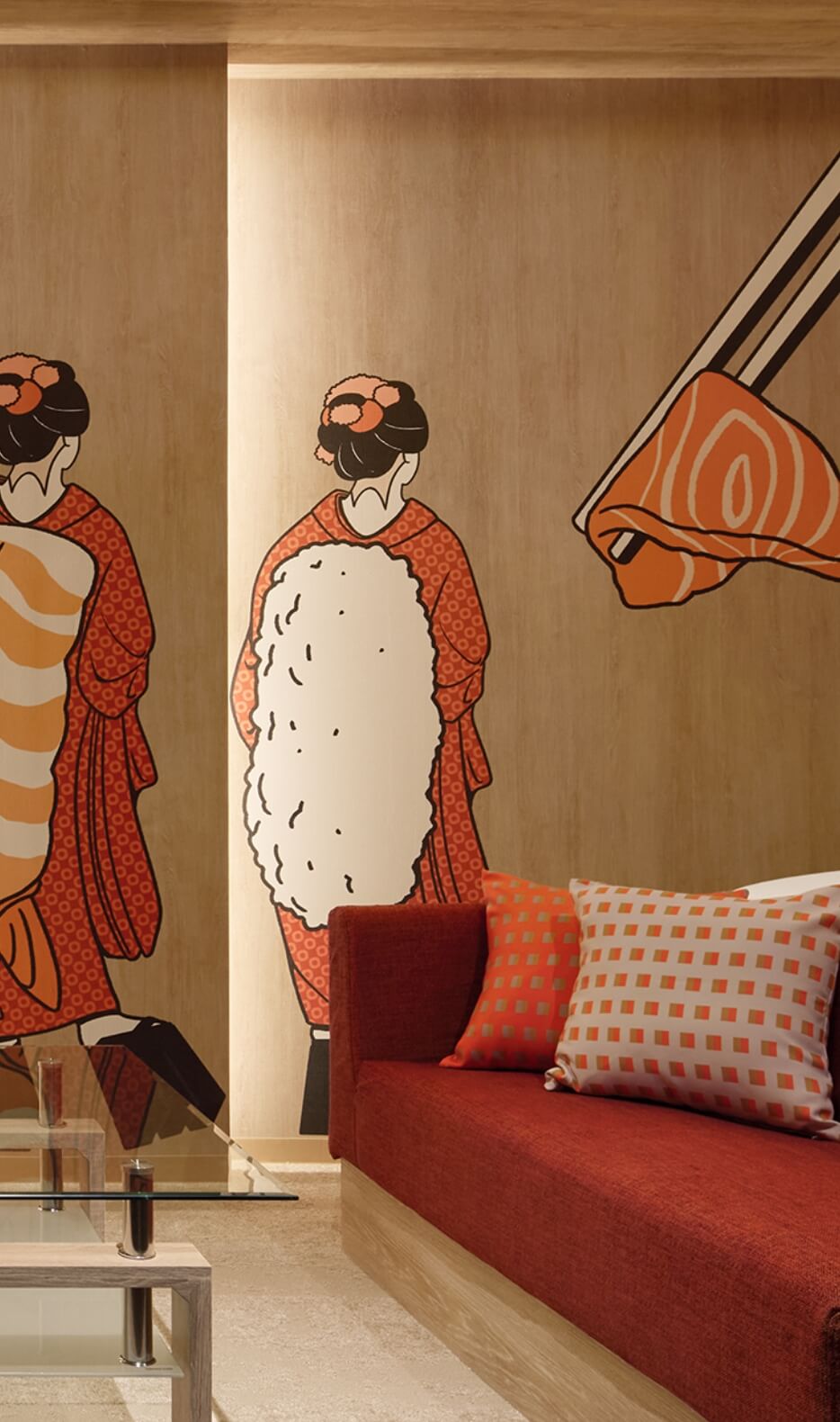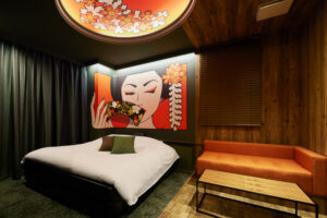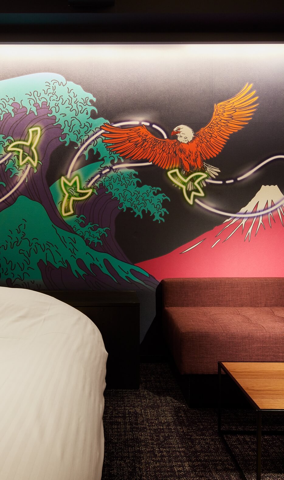 着飾った舞妓さんがモチーフのお部屋。寝室壁面にはダイナミックなスケールでグラフィックを落とし込み、よりインパクトのある空間に仕上げました。