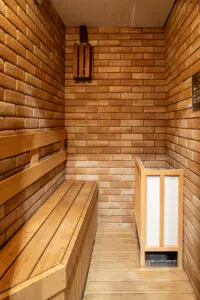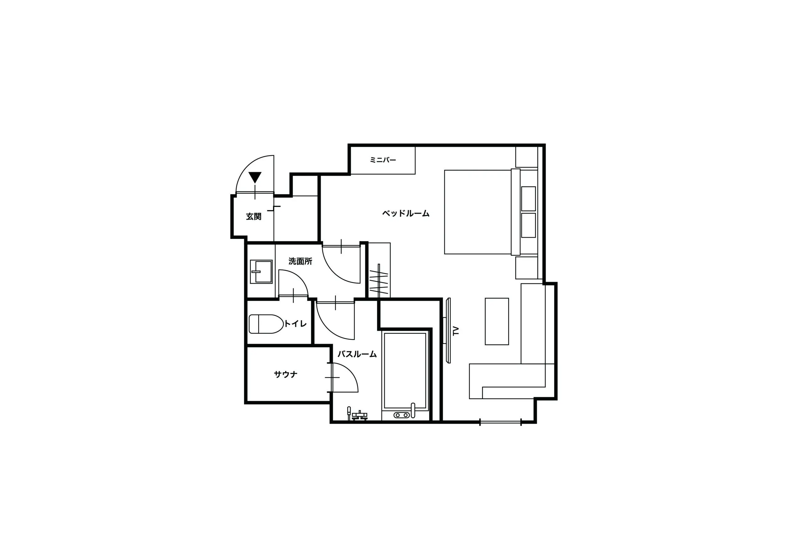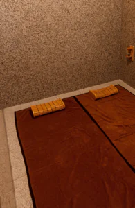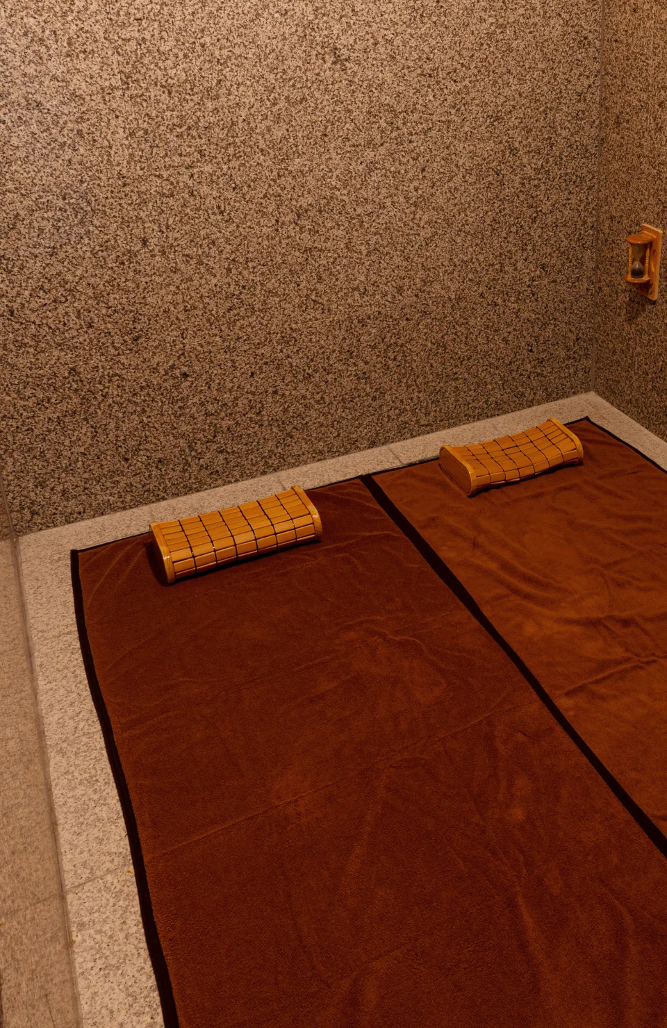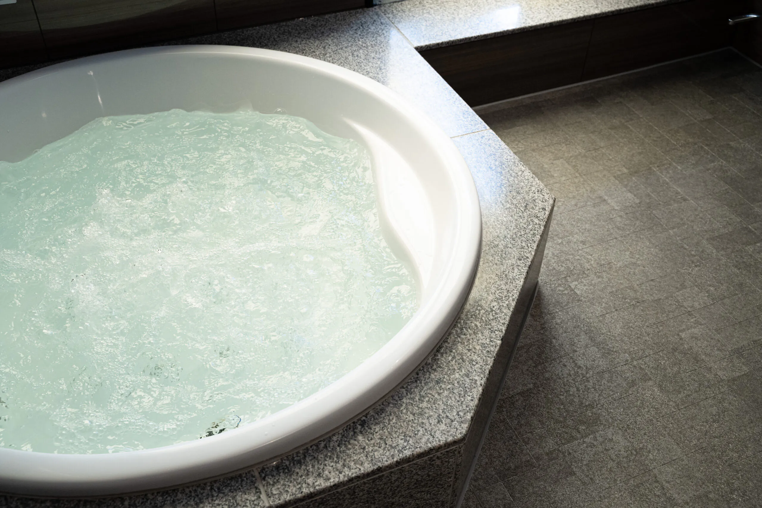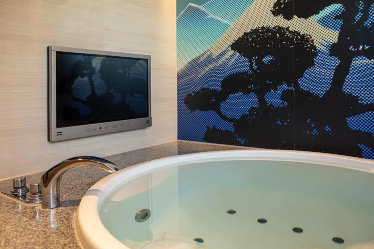 客室の内風呂でも、美容と健康に良い「ラドン」と「ゲルマニウム」の人工温泉をお楽しみいただけます。浴室のデザインも客室ごとに趣が異なり、空間ごと味わえるバスタイムに。サウナ後の水風呂としてもご利用でき、ご希望に応じて氷を加えて温度を下げることも可能です。