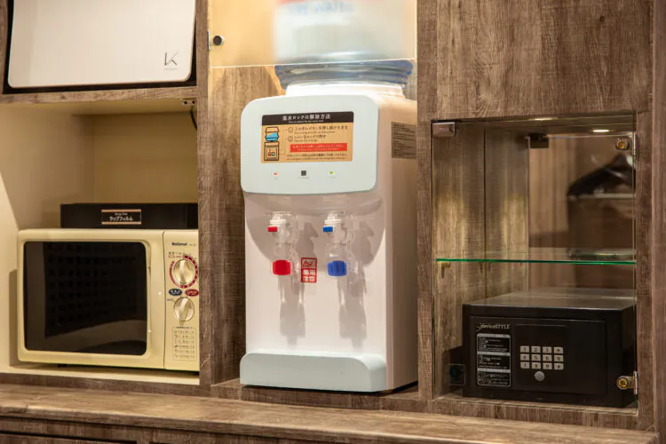 サウナ後の水分補給にも便利。いつでも冷たいお水、あたたかなお湯をご利用できます。