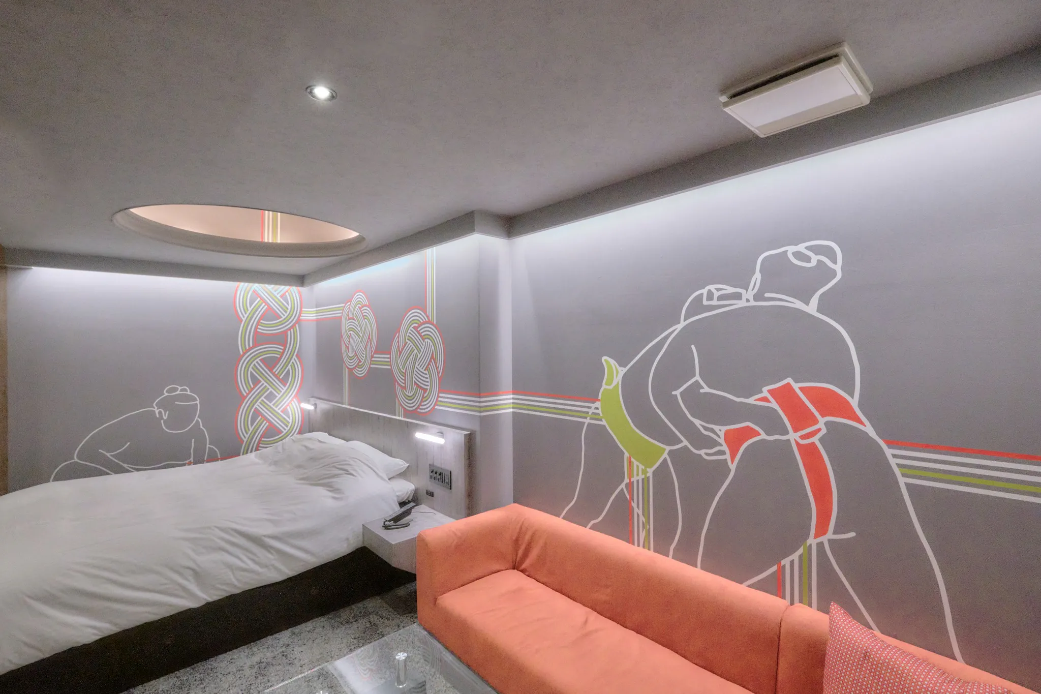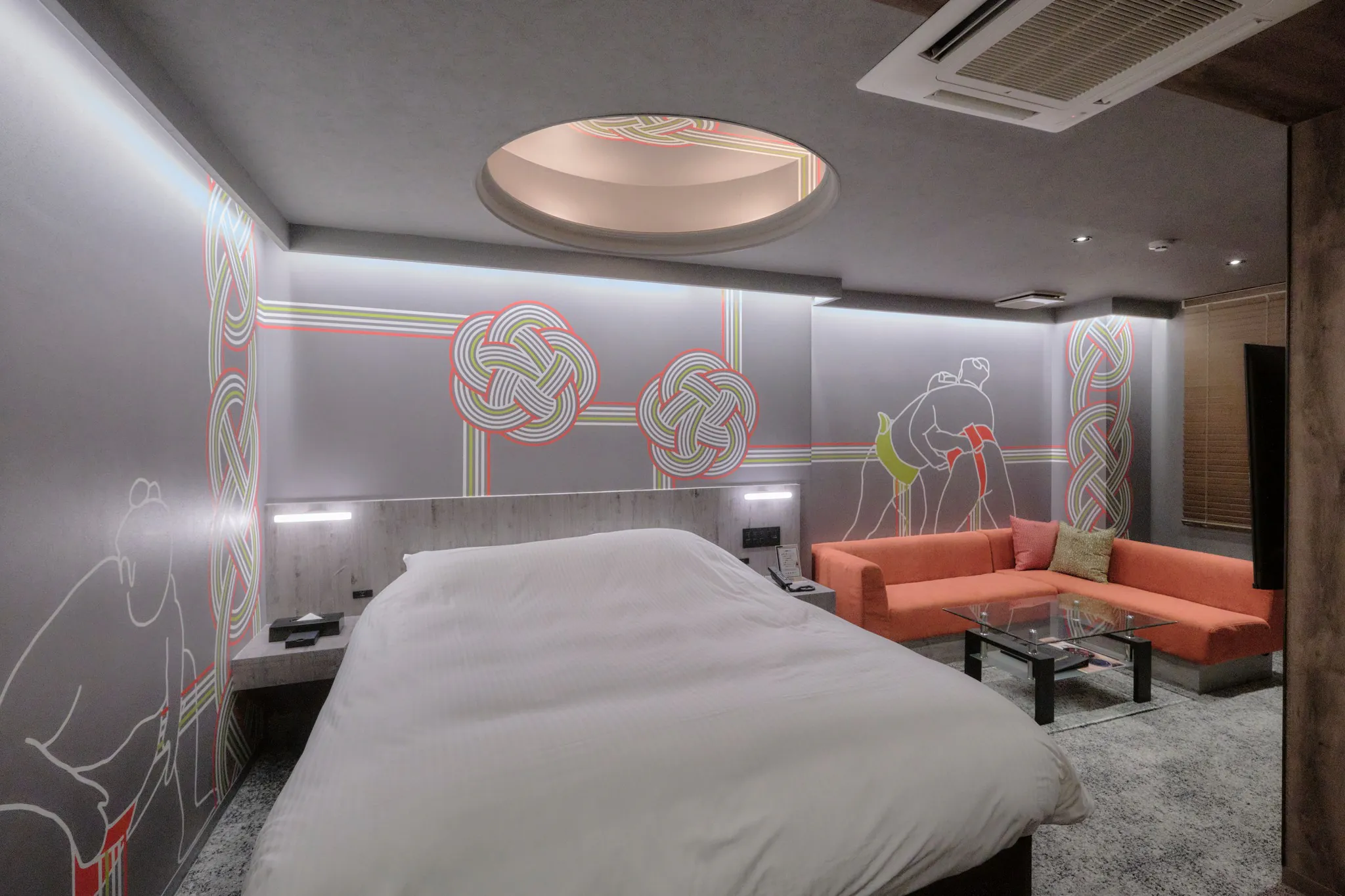 水引と相撲がモチーフのお部屋。水引と力士の廻しをリンクさせて部屋に落とし込むことで、ユニークな空間に仕上げました。