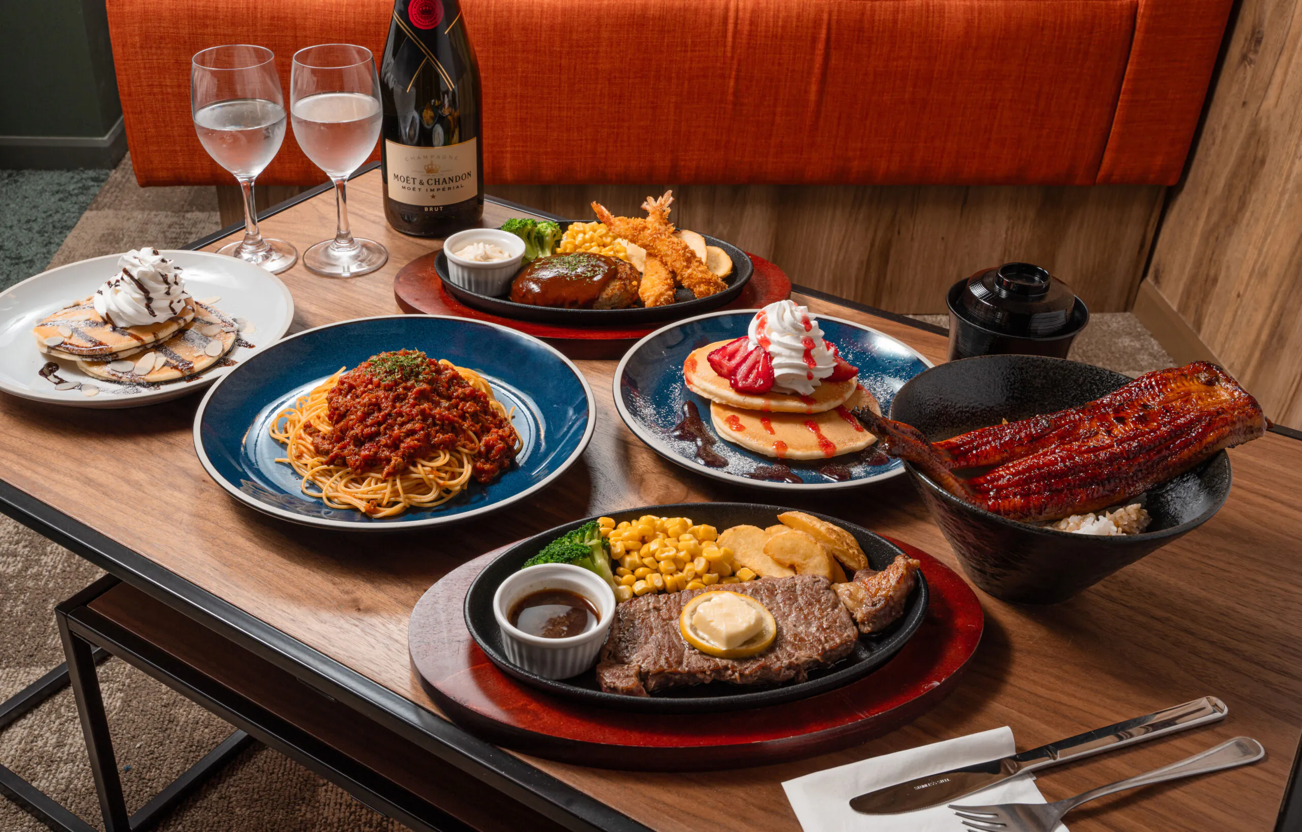 サウナでととのった後はフカフカのキングサイズベッドでリラックス。約70種類のサ飯やドリンク、スイーツまでお部屋で注文できるから、1日中おこもりステイしたい時にもオススメです◎。