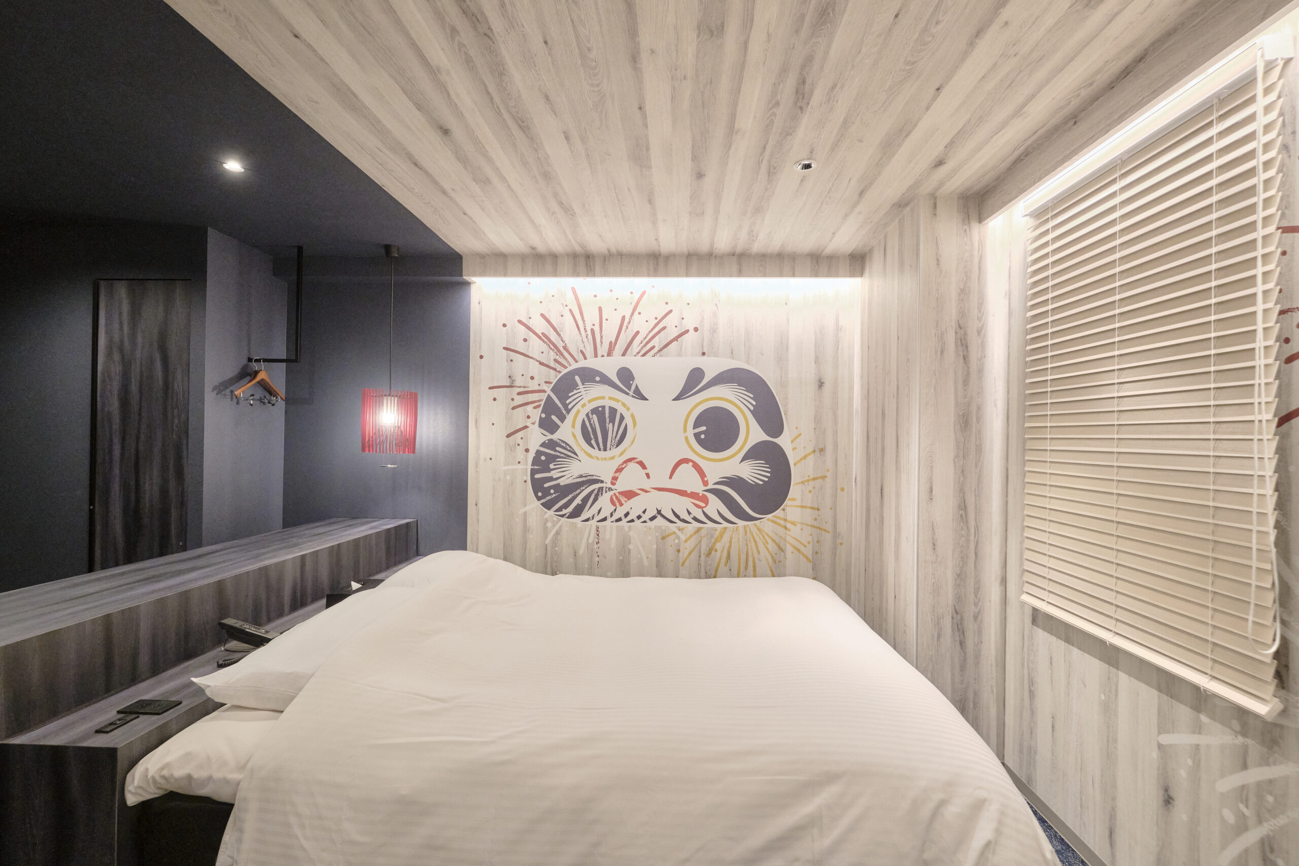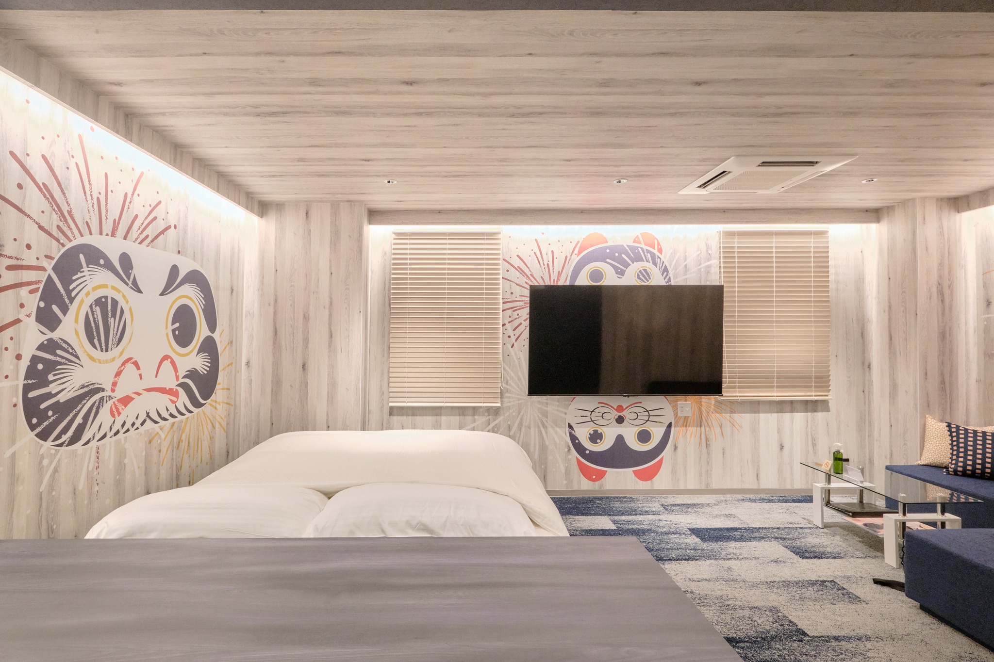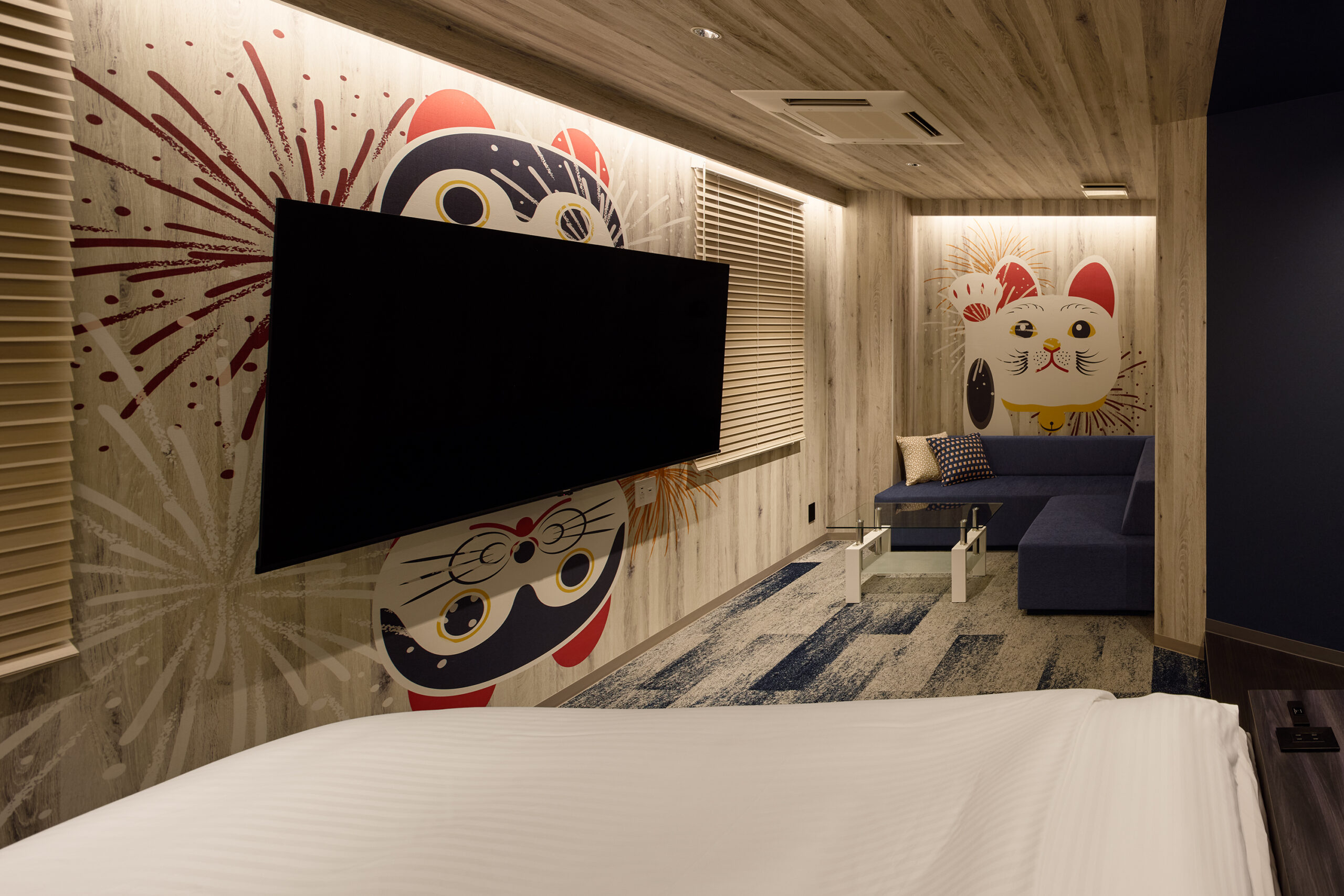 達磨・招き猫・犬張子の3つの縁起物がモチーフのお部屋。賑やかなグラフィッククロスと落ち着きのあるネイビーのクロスで、メリハリのある空間に仕上げました。